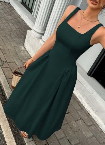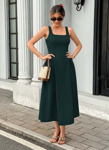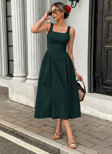 • Kadın askılı kare yakalı uzun ithal krep elbise